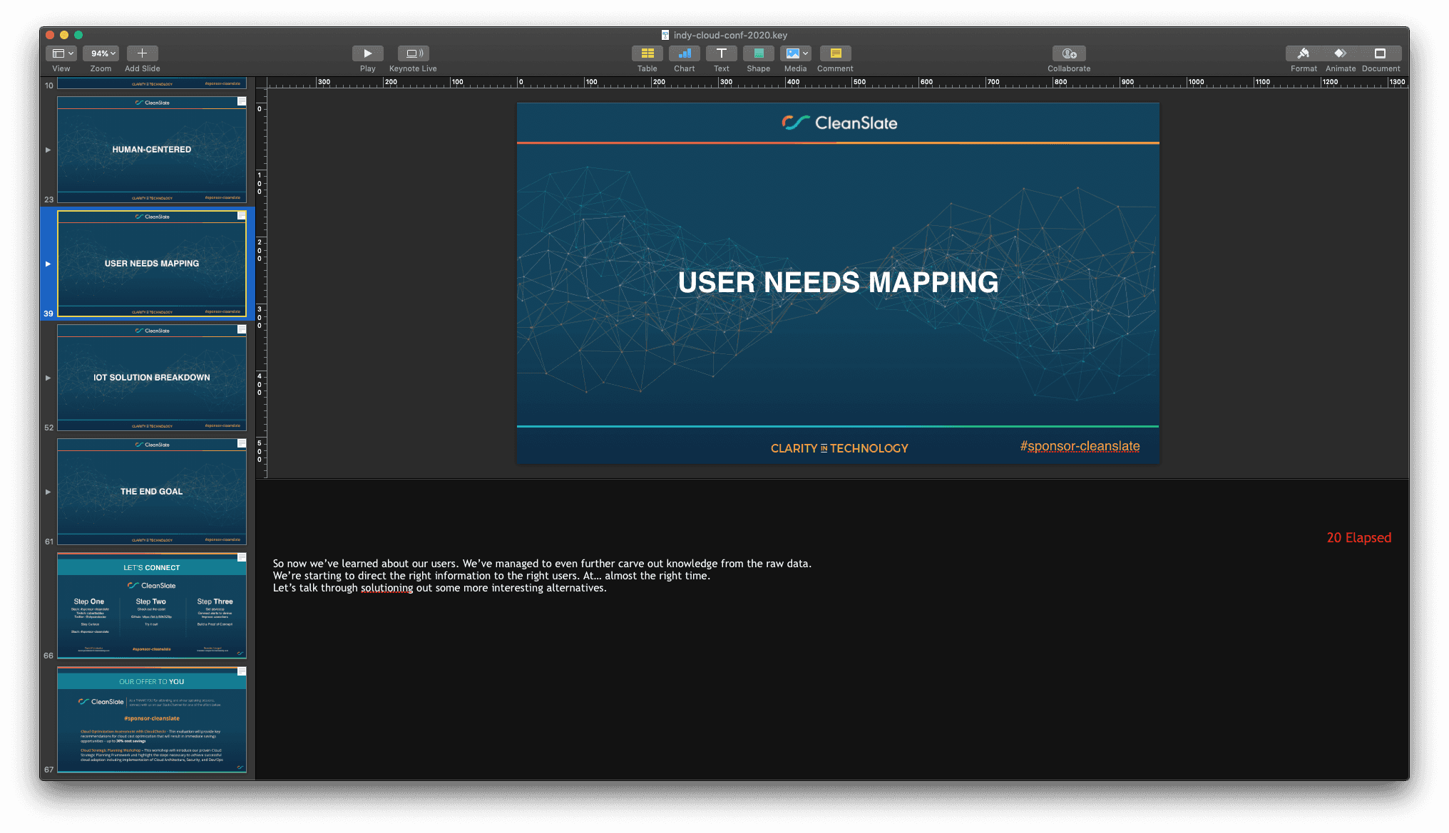 Speaking of timing, make sure you add some indicators in your speaker notes. I prefer something like the following on the major slides.