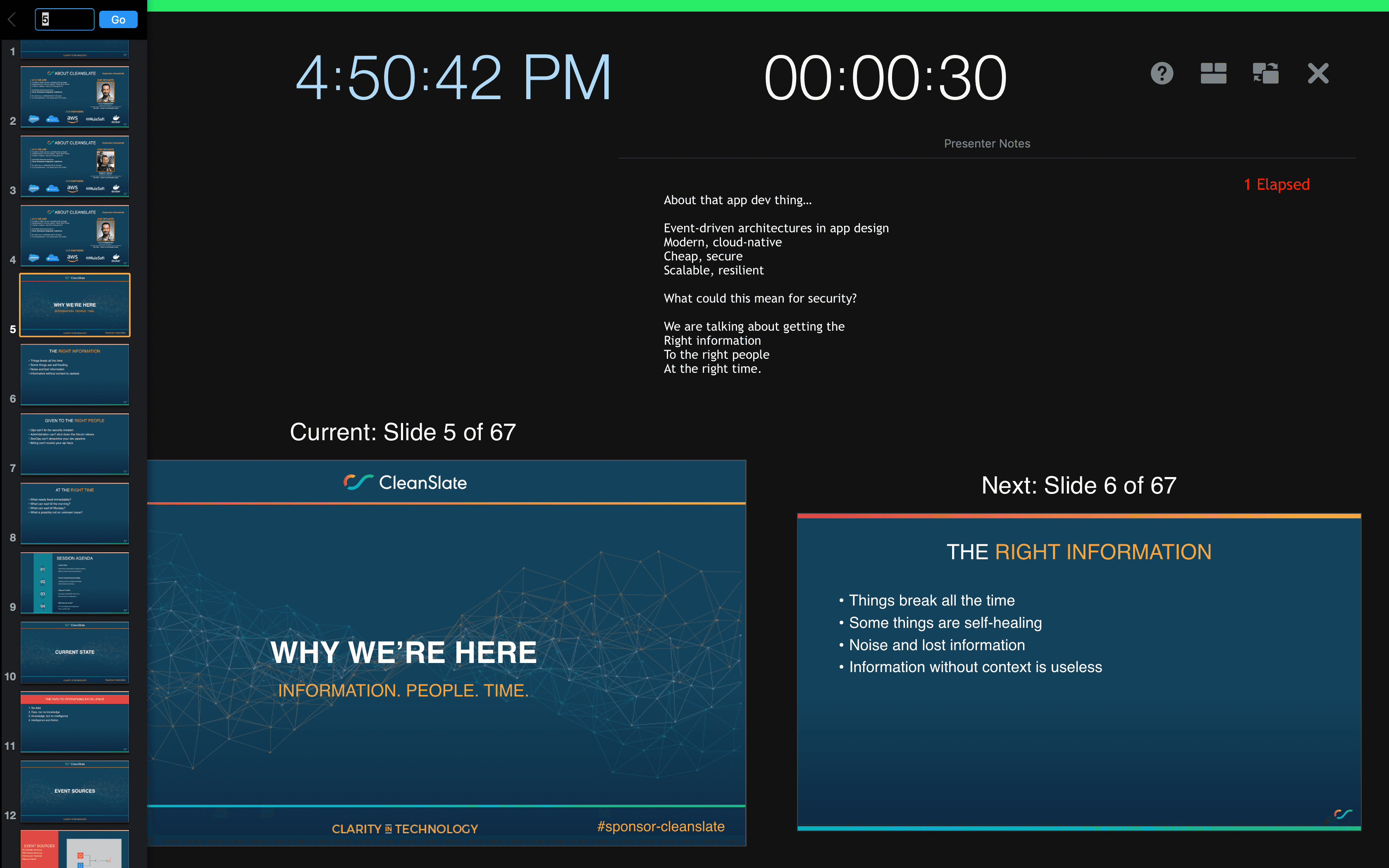 Additionally I key everything off the "elapsed time" timer because that doesn't depend on when your give a talk. And you don't have to change anything to present the content again somewhere else.